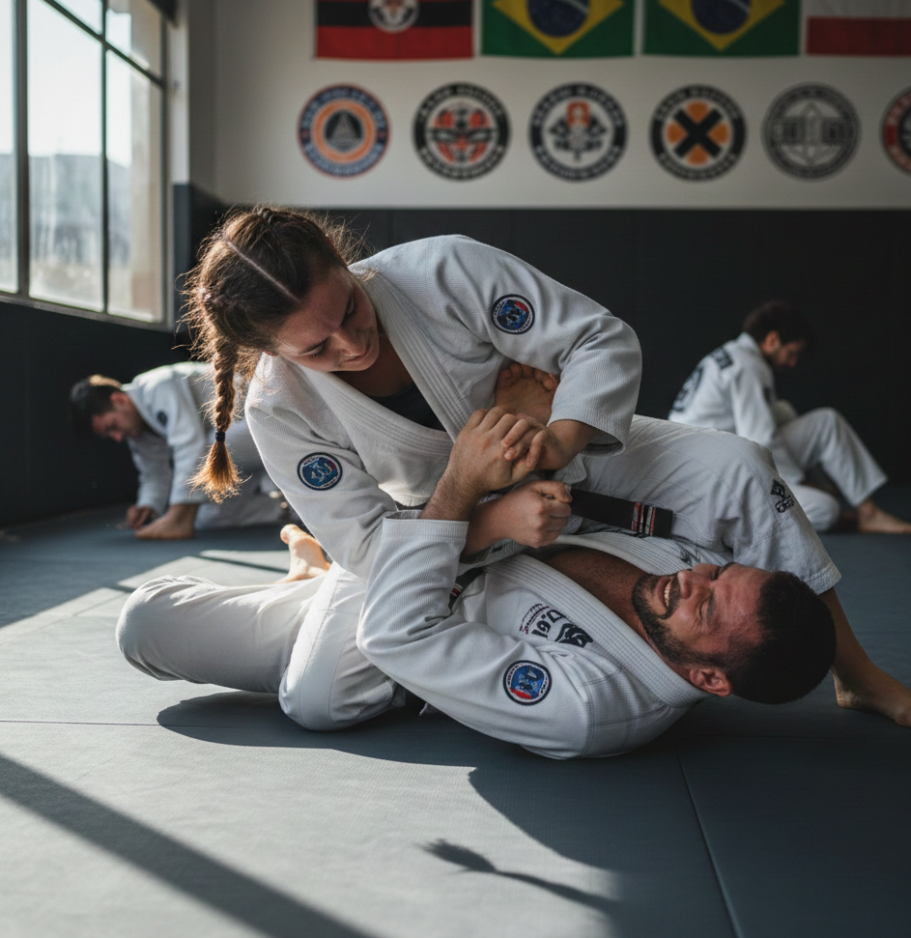 Jiu-Jitsu ermöglicht Menschen, körperlich überlegene Gegner zu kontrollieren. Der Fokus liegt auf der Kontrolle am Boden und darauf, den Gegner über Gelenkhebel und Würgegriffe zum Aufgeben zu zwingen.